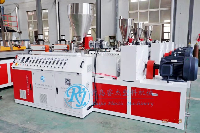 混料機(jī),磨粉機(jī),破碎機(jī),錐形雙螺桿擠出機(jī),模具,定型平臺(tái),托架,帶牽引機(jī),自動(dòng)無(wú)塵切割機(jī),機(jī)械手自動(dòng)卸料碼板。整線運(yùn)行穩(wěn)定,操作簡(jiǎn)單,故障率低。